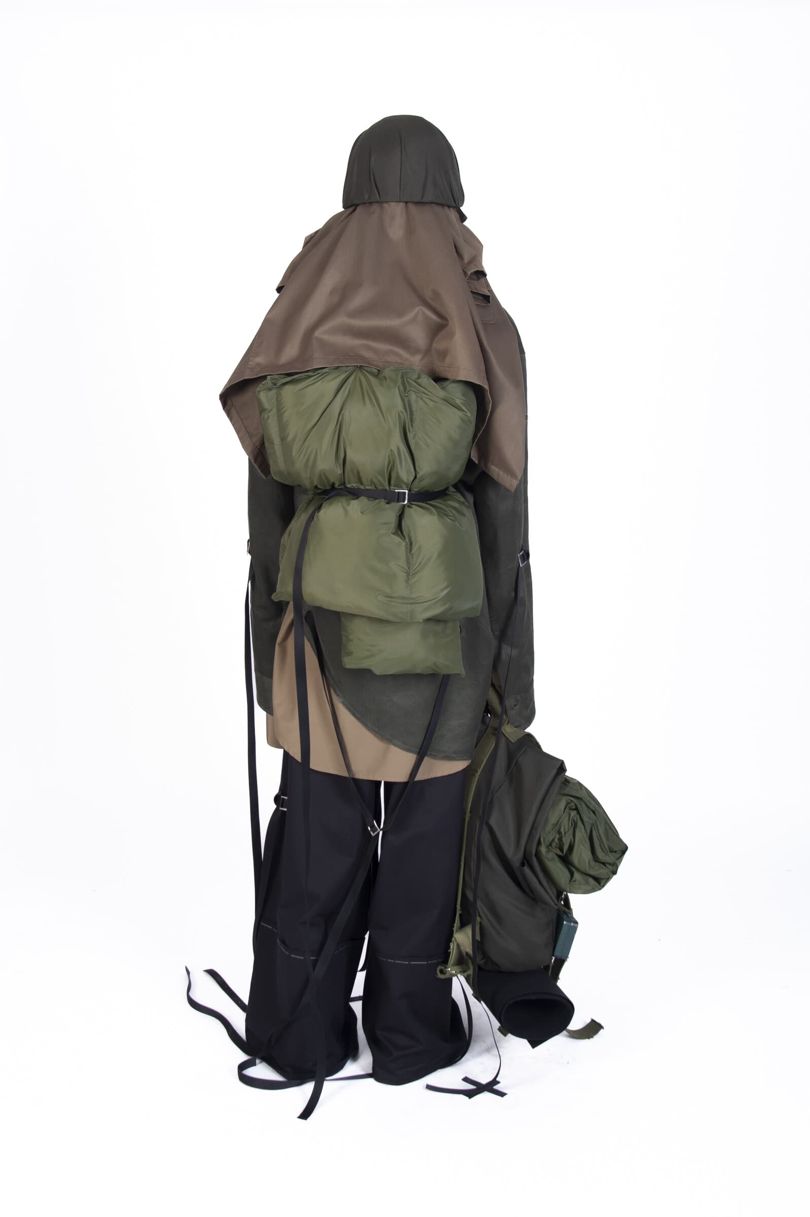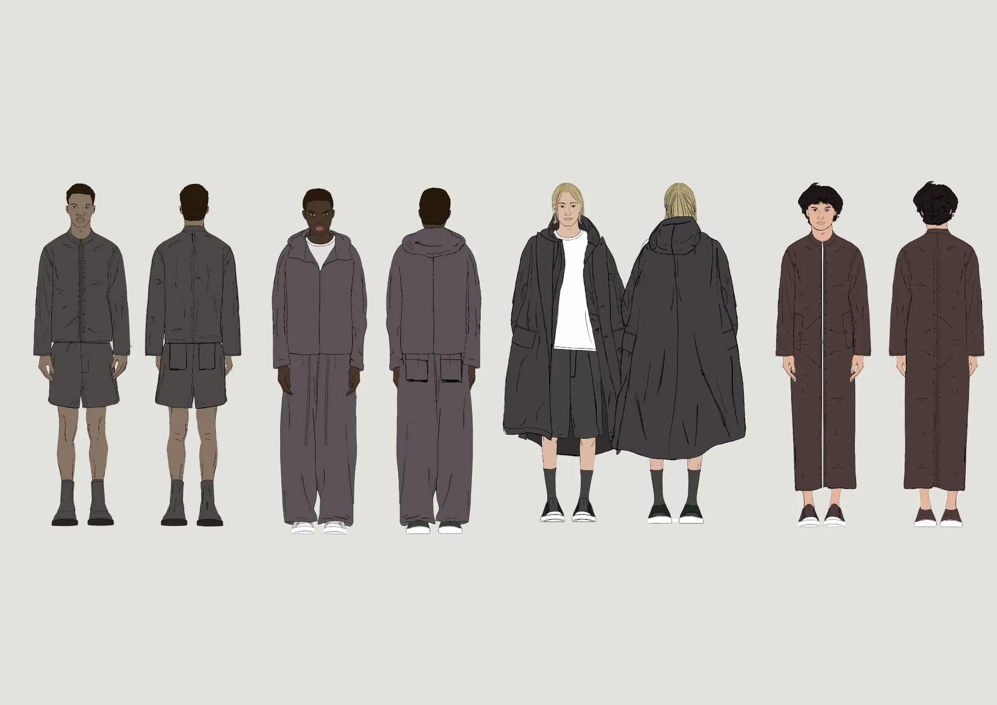 Coleção desenvolvida em dupla com Gabriel Pascolato no contexto acadêmico, apresentada em PDF. O projeto propõe o vestuário como interface técnica de adaptação entre indivíduo e natureza, investigando modularidade, funcionalidade e reconfiguração das peças. O material reúne narrativa conceitual, definição de público-alvo, pesquisa de materialidades, croquis e desenhos técnicos, estruturando a formalização completa da proposta.